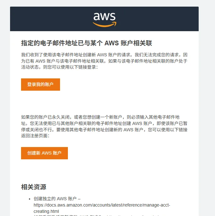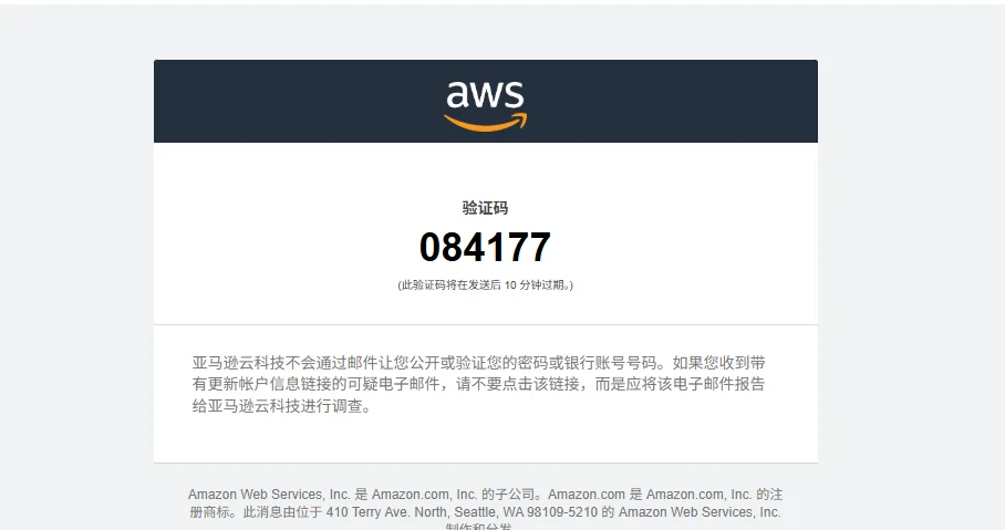 直接去邮箱找新邮件,找AWS发来的邮件,获取验证码,如果出现右图的邮件内容,证明你用的邮箱已经注册过亚马逊云了,不允许再次注册了。
