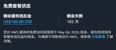 最后亚马逊云的正确注册流程就完成了,这是最稳妥安全可靠的注册方法。成功注册,进入主菜单,右上角展开看到免费额度,先收获100美元的182天。我看海外大厂都互相学习,这个账号只要你不升级将不会产生任何扣费,最多不能使用,再也不像当年一不小心乱扣费了。