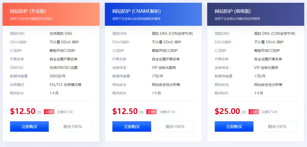 ●网站防护: 提供高防DNS、不计量DDoS保护、智能开启CC防护等功能,价格低至2.5折!