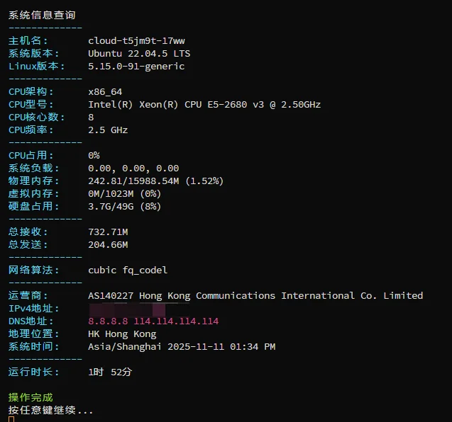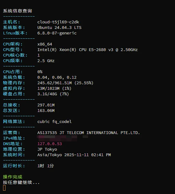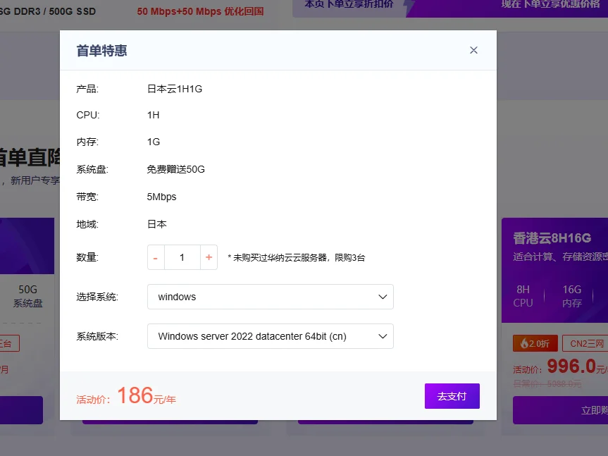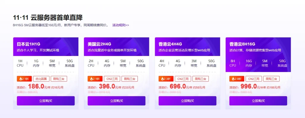 我们今天选择两款机型进行体验,一款日本1H1G一年186元的双十一入门机型。另一款面向高端企业级香港8H16G半年996元的机器。