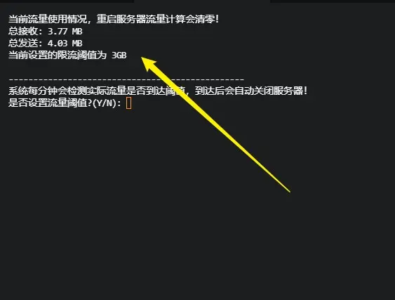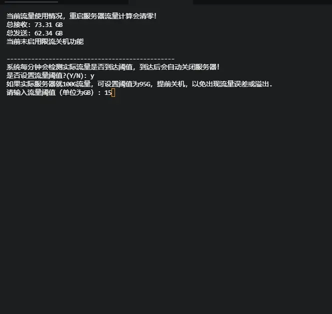 这 Bash 脚本用于监测服务器的网络流量使用情况,并根据预设的阈值进行操作。它首先显示当前的接收和发送流量,然后询问用户是否设置流量阈值。用户可以选择设置阈值,并输入所需的阈值(以GB为单位)。一旦设置了阈值,脚本将每分钟检测一次流量是否超过了该阈值。如果超过了阈值,脚本将触发关闭服务器的操作。这个脚本可用于限制流量使用,或在流量达到预定阈值时自动关闭服务器以防止不必要的费用或其他问题。