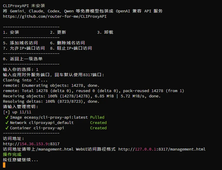 部署方式,先装CLIProxyAPI 一键搞定。我已经帮大家做成一键脚本了,安装设置登录密钥,自动docker部署。