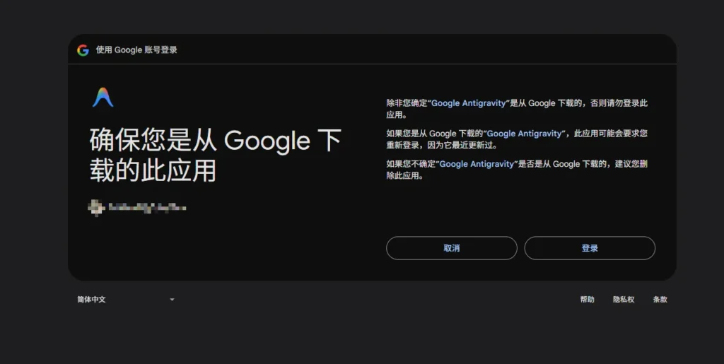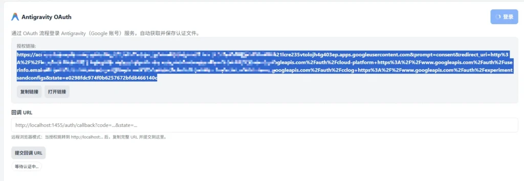 点击Antigravity(反重力) 的登录按钮生成认证URL,到官方去登录你的账号。