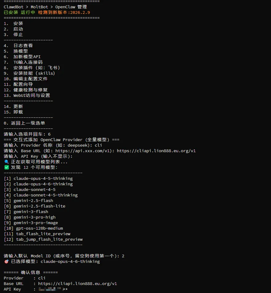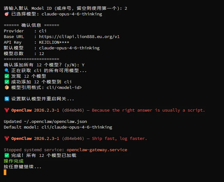 接下来将OpenClaw的安装与对接CLIProxyAPI,非常简单,依然是一键脚本,还是熟悉的配方。我优化了这个脚本他可以把你的CLIProxyAPI中的所有模型一次性导入,方便你快速切换模型,可谓是更进一步。