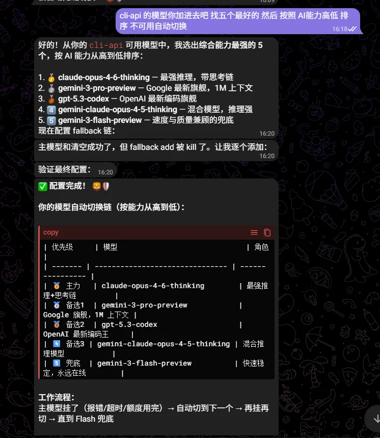 后续你可以让AI自己写容灾模式,付费的API短时间用尽了,降级到其他模型,如果付费高端模型恢复了再回到高级模型。就是这么玩的,永远不会死。我现在让AI帮我改网页,播报新闻,体验非常舒服。
