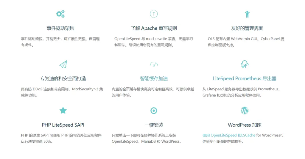 OpenLiteSpeed 将速度、安全性、可扩展性、优化和简单性结合在一个友好的开源包中。 立即下载 OpenLiteSpeed ,看看它能为您的网站做些什么!