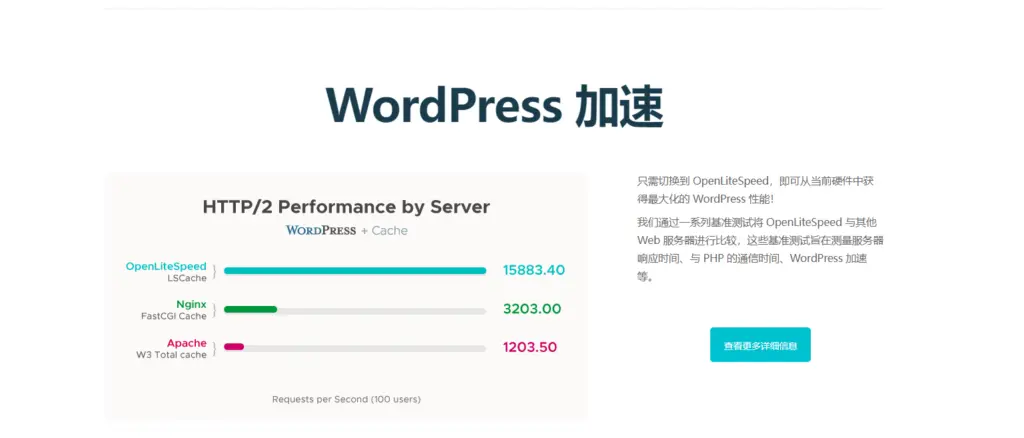 只需切换到 OpenLiteSpeed,即可从当前硬件中获得最大化的 WordPress 性能! 我们通过一系列基准测试将 OpenLiteSpeed 与其他 Web 服务器进行比较,这些基准测试旨在测量服务器响应时间、与 PHP 的通信时间、WordPress 加速等。