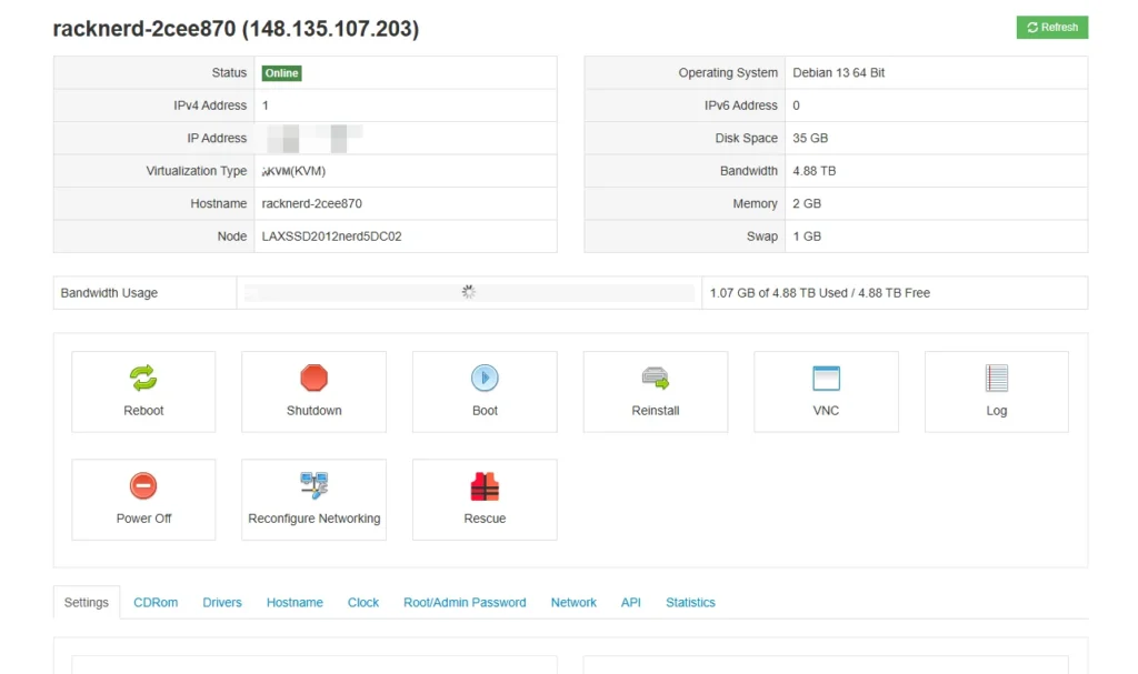 进入面板就能看到你新买的机器了,开机,关机,重装,救援等常规操作都在这里。