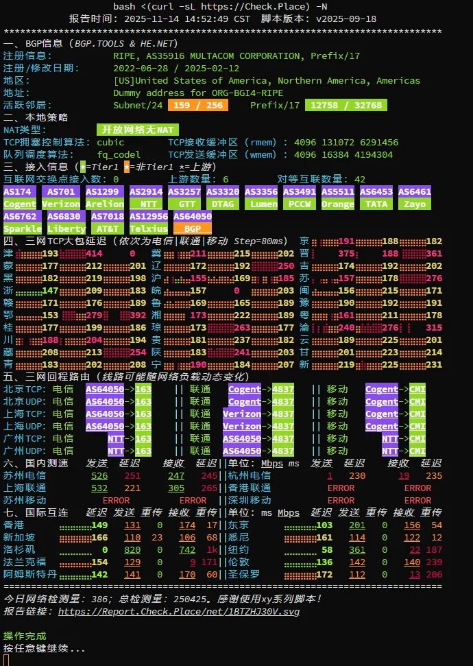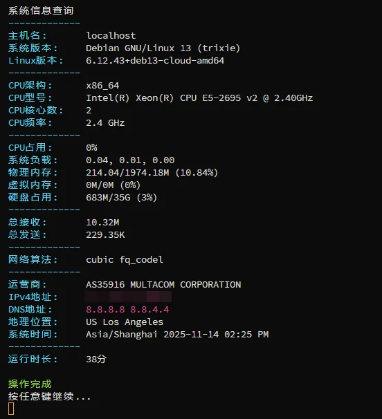 整体来看,这次入手的 RackNerd 洛杉矶 DC2 2H2G 小鸡表现还是挺让人满意的。原生 IP 质量不错,解锁情况也达标,25 端口开放这一点对有邮件需求的朋友来说尤其加分。线路虽然算不上顶级,但延迟稳定、无明显绕路,美西能控制在 150ms 左右已经可以给好评了。实际网络测速和基本性能也都对得起这个价位。加上 RackNerd 本身支付方式多、工单响应快、管理面板实用,整体体验算得上顺畅。如果你正好为黑五提前物色便宜大碗的小鸡,那么这台洛杉矶 DC2 或许是一个不错的候选。