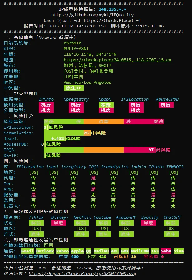 原生IP,纯净度较好,25端口开放可以做邮件服务器,IP解锁状态也不差。