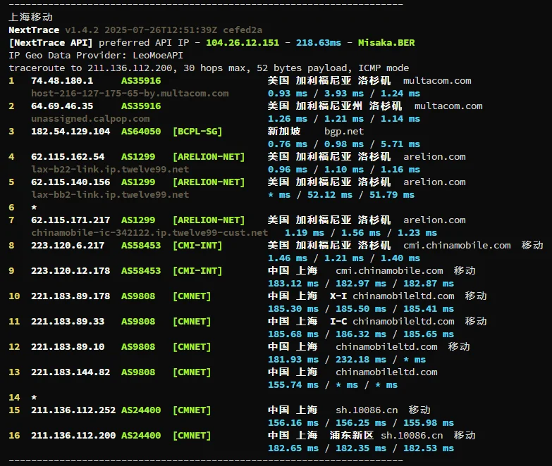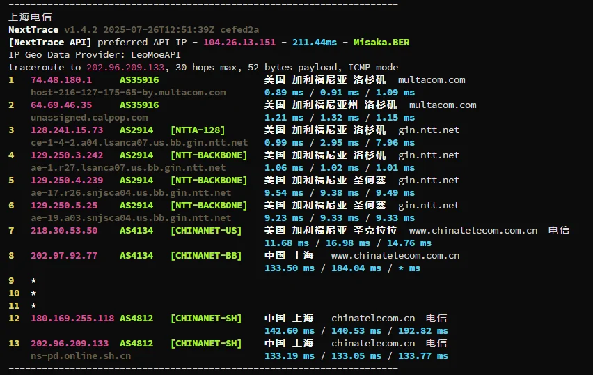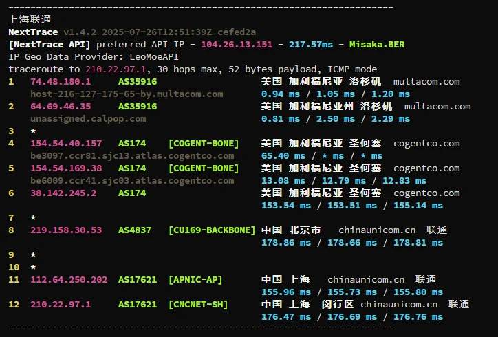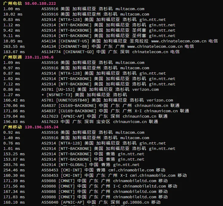 虽然不是什么优质线路,但延迟看上去还是比较低,对于美西能能控制在150左右都是很强的。线路基本没有绕,比较直。
