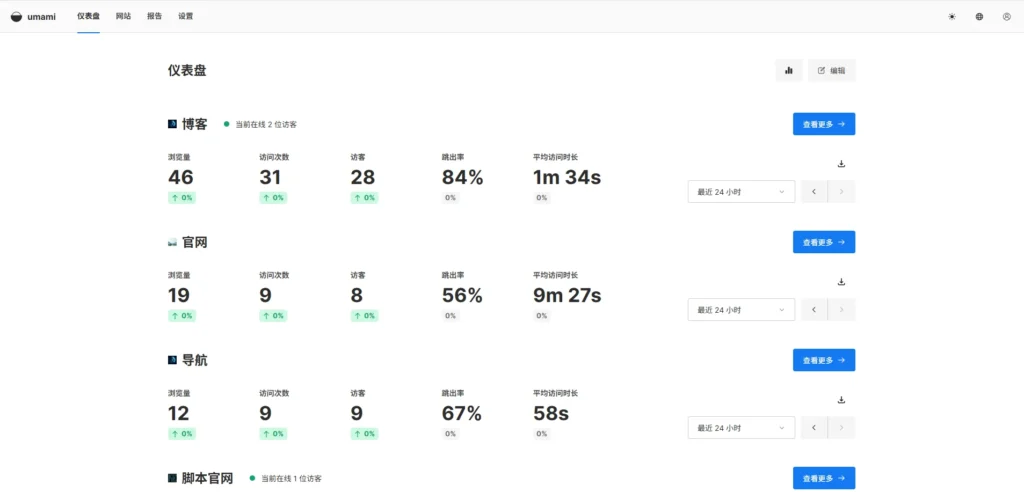 好了这样你在Umami后台就能看到这个站点的流量数据了,你可以访问你的站点试试,看是不是能俘获流量数据。