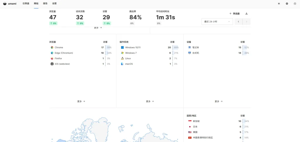 我已经把自己主要的几个网站全部加入到统计队列中了,方便直观一目了然,可以查看访问者浏览器,系统,设备,国家,构建历史流量曲线等等。