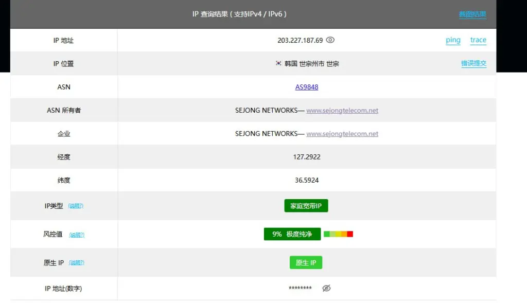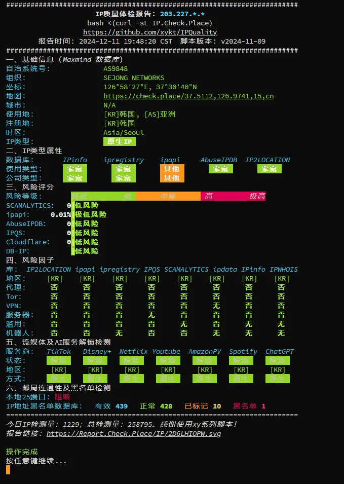 荫云VPS 韩国原生双ISP 住宅IP 解锁超棒 好干净的IP!